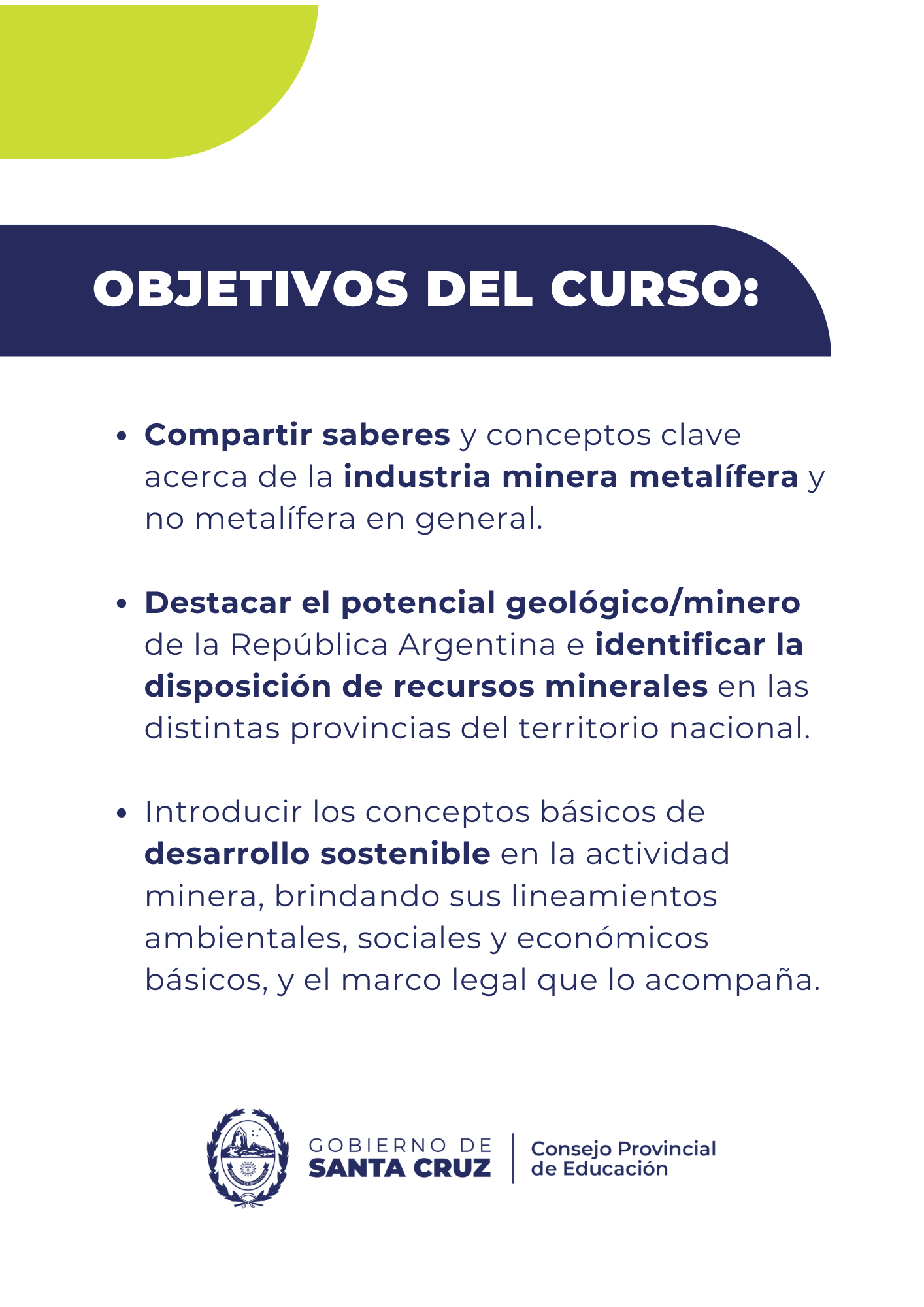 La propuesta formativa tiene como propósito compartir saberes y conceptos fundamentales sobre la industria minera metalífera y no metalífera, resaltando el potencial geológico y los recursos minerales de la República Argentina. Asimismo, busca introducir los principios del desarrollo sostenible en la actividad minera, abordando sus dimensiones ambientales, sociales, económicas y el marco legal vigente que la regula.